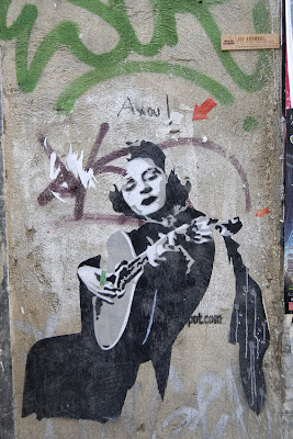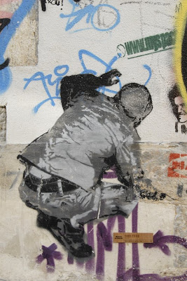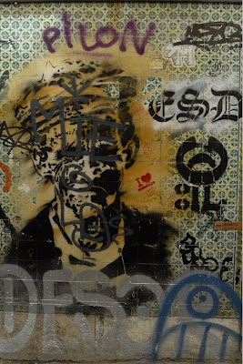 O stencil que estás a observar é de Dalaiama. Com uma obra transversal na cena urbana, este artista procura oportunidades de intervenção ao nível do graffiti bombing, bem como de criação de stickers, colaborando com vários artistas da grande Lisboa, por essemplo Crew L permitindo uma difusão do trabalho por Lisboa, Cascais, Estoril e Margem Sul. Destaca-se a atitude corrosiva presente em toda a linha de imagem com fortíssimos traços de intervenção político-social. Para saber mais sobre as obras deste artista entra en http://dalaiama.blogspot.com
