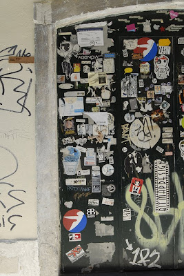 Este portão é um clássico do sticker de Lisboa e um ícone do Museu Efémero. Aqui podemos observar diferentes estilos e formatos de stickers entre os quais destaca-se a obra de What: os bonecos com frases escritas na sua barriga. O autor desta obra é natural de Mendoza, Argentina. Há vários anos que desenvolve a sua arte a nível internacional. Frases sempre provocatórias e directas são a fórmula para que nunca passem despercebidas aos olhos dos transeuntes. Para saber mais sobre este artista entra en http://www.whatattack.blogspot.com