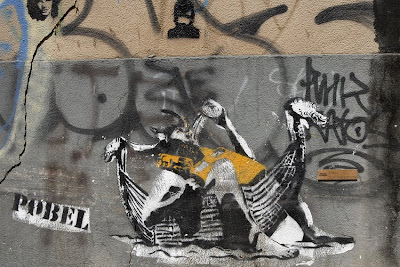 Esta obra é de Pobel. Na senda de Dolk, surge este artista norueguês, que opta no entanto por uma postura bem discreta, próxima do secretismo. Em Lisboa, encontramos vários stencils da sua autoria, com um dos seus símbolo máximos, o viking, dispersos pelo Bairro Alto, que fazem parte do Museu Efémero.
